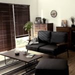 [実例写真の主要インテリア:ソファ・スツール・センターテーブル・チェスト・キャビネット・グリーン・ウッドブラインドで計算。]