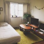 [実例写真の主要インテリア:センターテーブル・ベッドフレーム・ラグマット・テレビボード・グリーンで計算。]