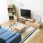 [実例写真の主要インテリア:ソファ・センターテーブル・ラグマット・テレビボード・シェルフで計算。]