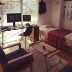 [実例写真の主要インテリア:ソファ・センターテーブル・PCデスク・チェア・ラグマット・ベッド・ナイトテーブルで計算。]