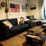 色使いがとても上手く、ターコイズカラーに近いラグや、ネイビーのソファなど、単純に「ブラック系」に走ることなくヴィンテージ感を演出しています。