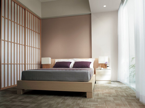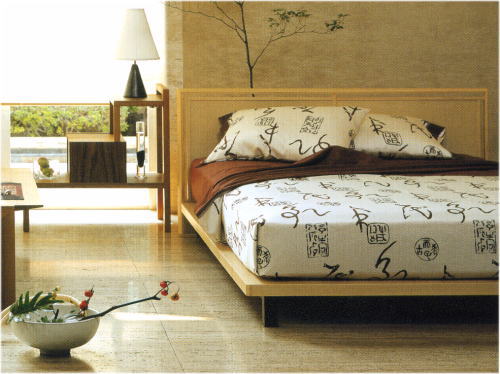 このコーディネートが素敵なのは、浴衣風のブランケットカバーとベッドの近くになる素敵な生け花のオブジェ、そして、木製ベッドフレームに飾られている1本の木のもつ癒し効果といえます。