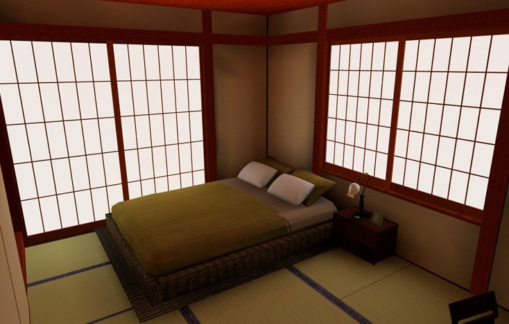 素敵な和風寝室のインテリアで、こんな部屋だったらいいな、といった和室風の寝室にマッチするオシャレなベッド。